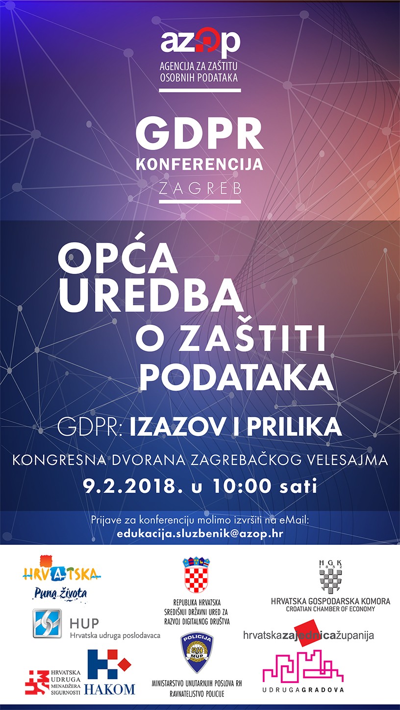 U svijetlu predstojećih izmjena propisa u području zaštite osobnih podataka, kroz kampanju podizanja svijesti cjelokupne javnosti o zaštiti osobnih podataka te u sklopu obilježavanja Europskog dana zaštite osobnih podataka AZOP poziva sve zainteresirane da se prijave na Konferenciju „Opća uredba o zaštiti podataka – GDPR: izazov i prilika“ koja će se održati 9. veljače 2018. godine u Kongresnoj dvorani Zagrebačkog velesajma.