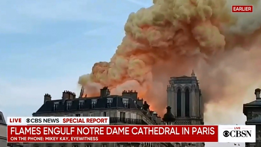 Pariški vatrogasci objavili su kako gori Notre Dame. Na snimkama se vidi kako iz zgrade suklja gusti crni dim. Očevici govore kako se plamen diže i do 20 metara u zrak. Reporter francuske televizije France24 javlja kako se krov urušio.