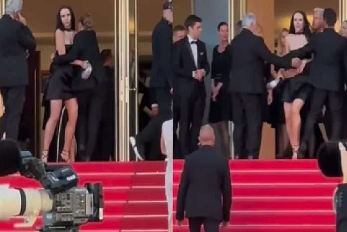 U viralnoj snimci koja je pogledana gotovo 17 milijuna puta, vidi se zaštitarka kako omotava ruke oko Pontyjske i odmiče ju od tepiha.